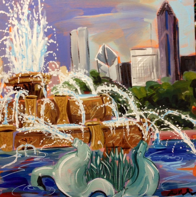15th painting of 30 is " Buckingham Fountain", 10'x10" Acrylic on board. Buckingham Fountain is located in Grant Park. It is the number one attraction in Chicago and is free! The fountain represents Lake Michigan and the four sea horses represent the four states that boarder Lake Michigan. It was design with the fountains of Versailles in mind. It's spectacular, go see it!