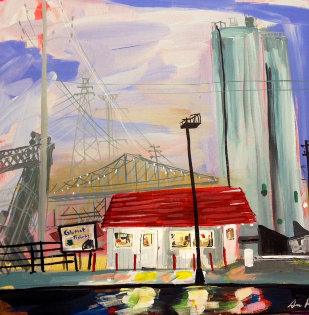 Day 13 "Calumet Fisheries, 95th Street Bridge" 12" x 12" Acrylic on Board. Another South Side eatery famous for it's natural wood smokehouse. The very same bridge the Blues Brothers jumped over! Know for it's delicous smoked salmon and fried fish. This series is leaving me hungry all the time!