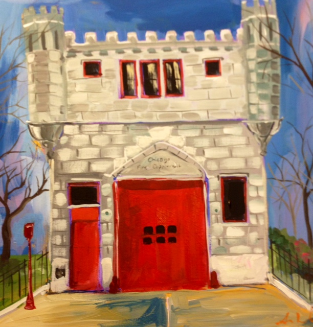 Painting day 26 is "Chicago Fire Station #98" 12 " x 12" same style as Water Tower Place and the pump house located just blocks from them on 202 East Chicago Ave.