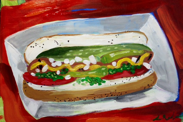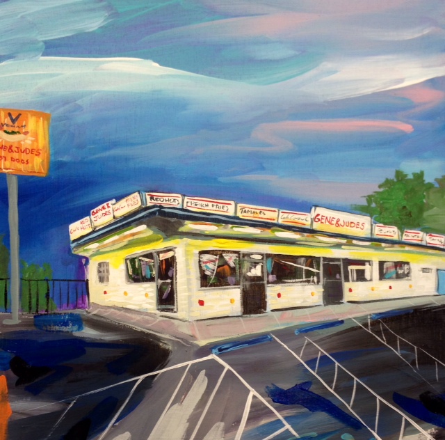 Day 12 is "Gene & Judes Red Hots", 12" x 12" Acrylic on board. Voted best hot dogs in America by Rachel Rayand Serious Eats judges! I'm craving a dog!