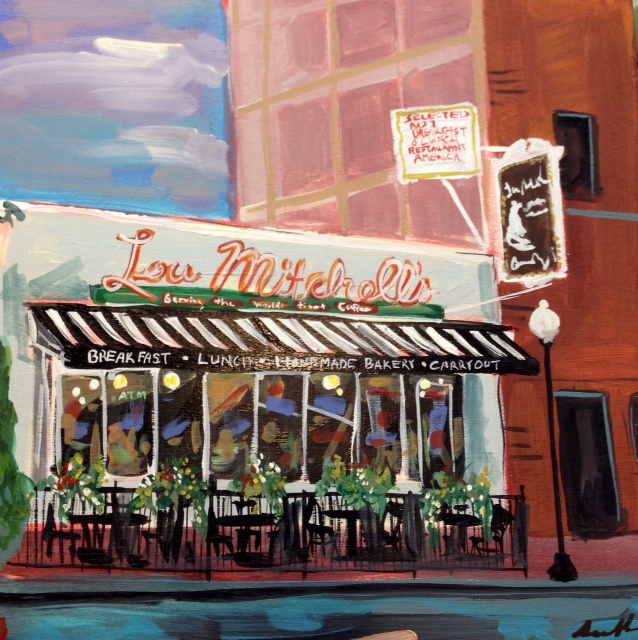 Day 14 painting is "Lou Mitchell's" 12" x 12", Acrylic on Board. Founded in 1923, Lou Mitchell's is know for handing out fresh donut holes to people waiting to be seated. Lou's claim to fame is fluffy eggs, the secret is using double yokes!