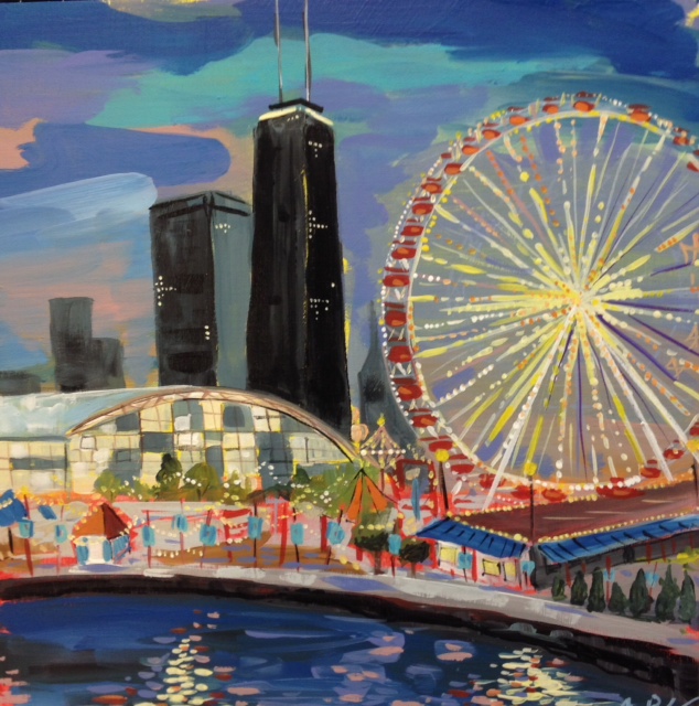 16th of 30 paintings is "Navy Pier" 12'x12" Acrylic on board. Explore all 50 Acres of Navy Pier with amusement park rides, museums, Shakespeare, Food, Food and more Food. Amazing views of the city as well with the John Hancock towering overhead.