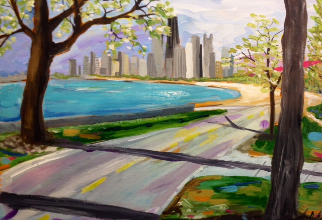 "So Long Chicago" 10" x 14" Acrylic on board. A view along the lakefront towards Oak Street Beach and the skyline. I love Chicago!