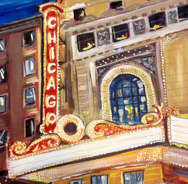 "The Balaban and Katz", 12" x 12' Acrylic on board. Built in the French Baroque style, the Chicago Theatre's exterior features a miniature replica of Paris' Arc de Triomphe, sculpted above it's State Street marquee. This piece of Chicago history is worth the trip even if you're not seeing a show.