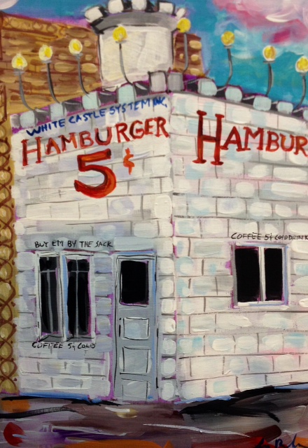 21st of 30 paintings, "White Castle" 6" x 8" White Castle didn't begin in Chicago, but the buildings were modeled to resemble the Chicago Water Tower Pump house and I've eaten alot of White Castle hamburgers in Chicago!