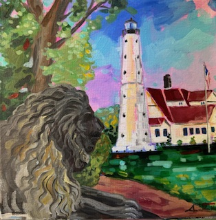 Day 17, "Lions at the Lighthouse" 12x12, Acrylic on canvas. Watch out for the lions at the North Point Lighthouse, Milwaukee. North Point Lighthouse stands tall, it's lantern room 140 feet above Lake Michigan. On the east side of the lighthouse are the "lion bridges" that cross a couple ravines on the south side of the building. The bridge that crosses this ravine was built in the late 1800's and provides an outstanding view.