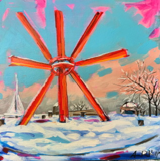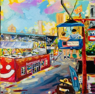 Day 10, "World's Largest Music Festival", 12x12, Acrylic on canvas. A Wisconsin tradition, Summerfest is a concert series along Milwaukee's Lake Michigan lakefront. It attracts over 800,000 visitors during this week long celebration. Food vendors, carnival rides, music and more make this a summer highlight since 1968.